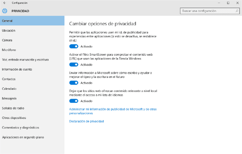 Inicio. Configuracion . privacidad DESACTIVO TODO