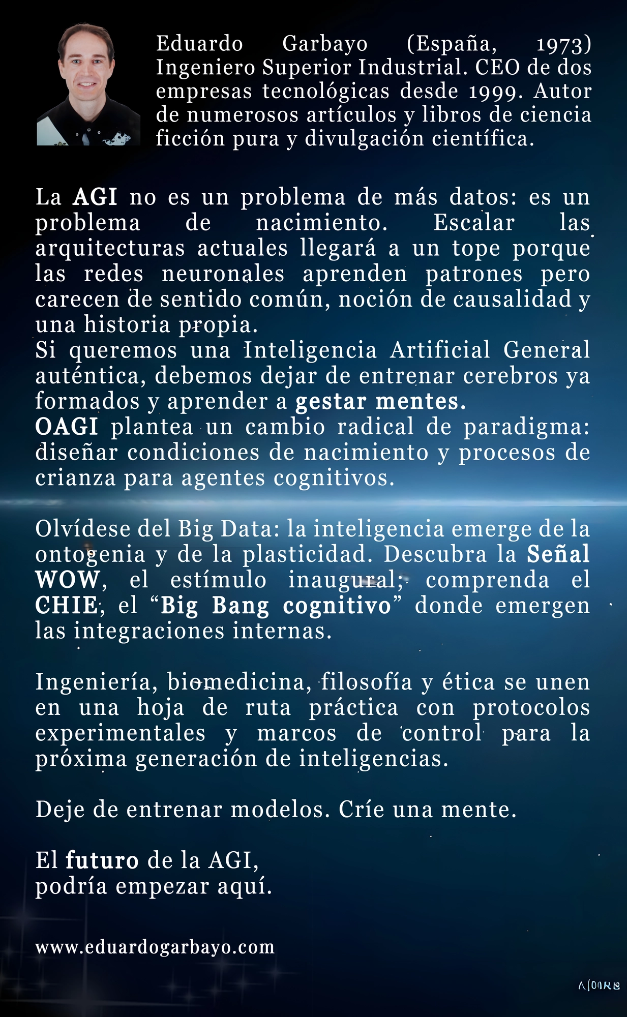 OAGI plantea un cambio radical de paradigma: diseñar condiciones de nacimiento y procesos de crianza para agentes cognitivos. Olvídese del Big Data: la inteligencia emerge de la ontogenia y de la plasticidad. Descubra la Señal WOW, el estímulo inaugural de un agente; y comprenda el CHIE, el “Big Bang cognitivo” donde emergen integraciones internas que exigen gobernanza ética desde el diseño.