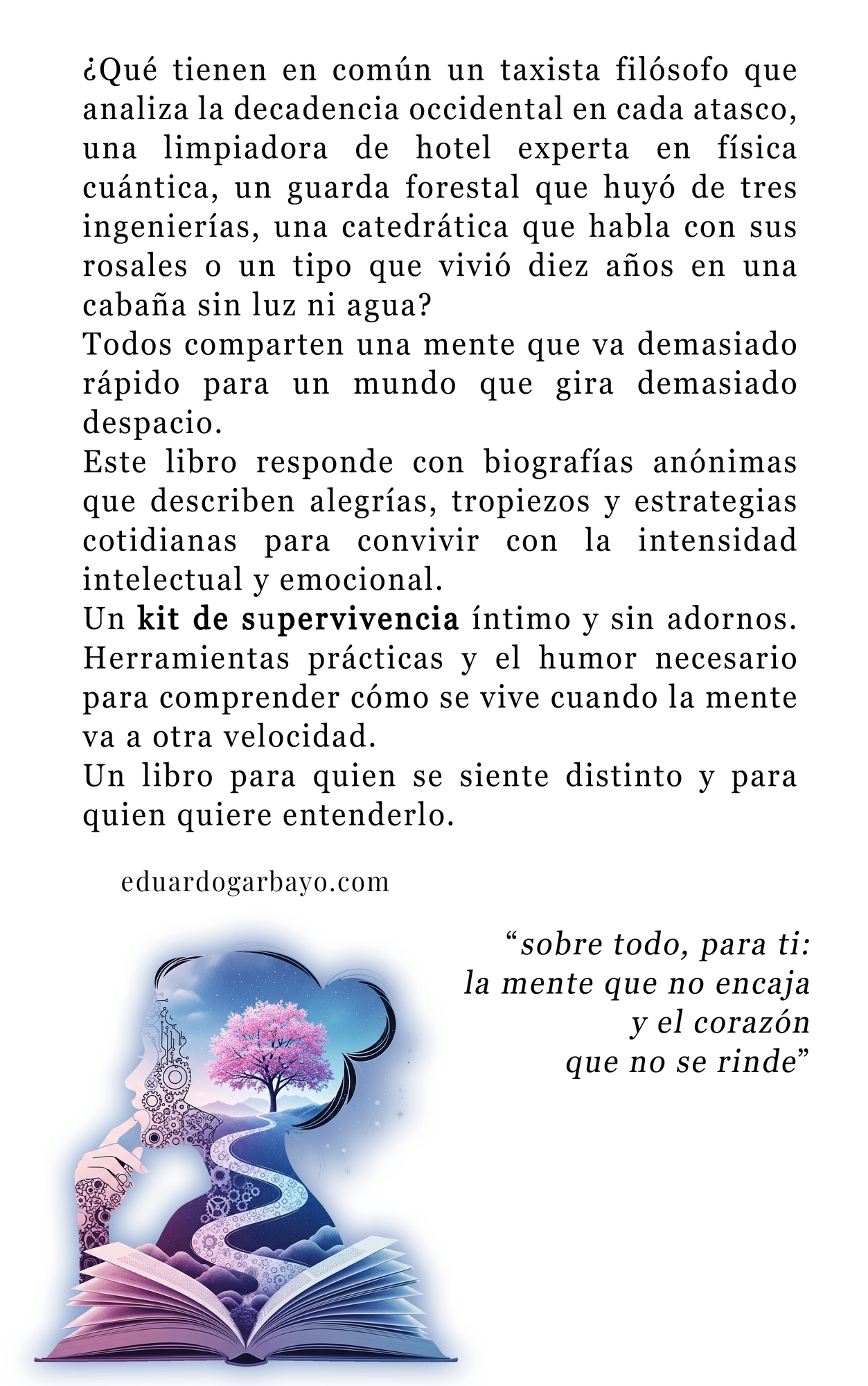 Este libro responde con biografías anónimas que describen alegrías, tropiezos y estrategias cotidianas para convivir con la intensidad intelectual y emocional.